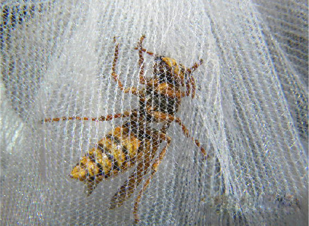 施工者自身がハチによる事故に遭わないよう、蜂駆除専用の防護服、防護手袋を装着します。